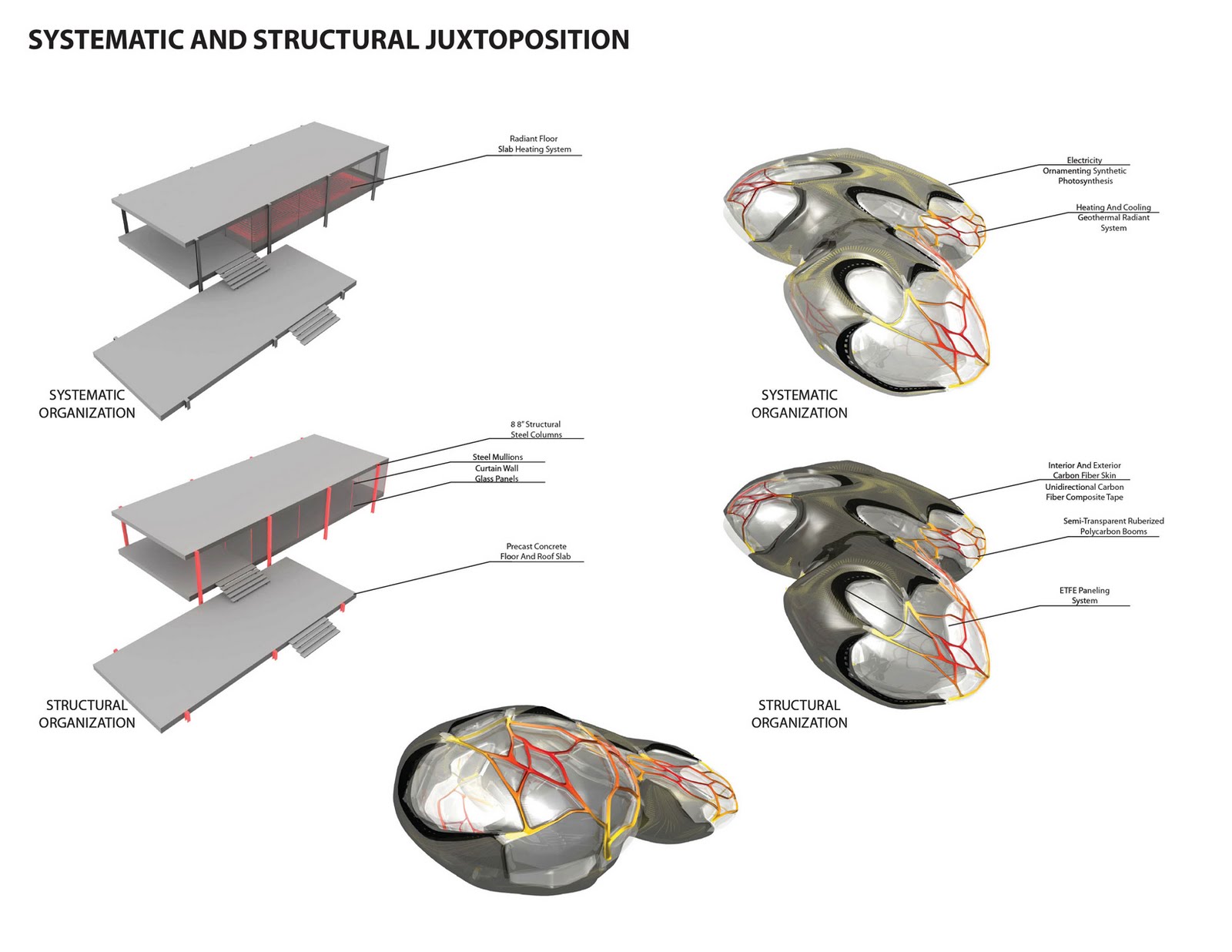 The Mitchell Lab systems research and design combines an integration of complex patterning with new HVAC and electrical technologies; the essence of the design is the articulation of a fluid flow system. This system operates performatively and in terms of sensation. Indeed, the goal of the Mitchell Lab was to design a house for the future that explored the argument of transparency through a different language that was used in the Farnsworth House by Mies Van Der Rohe. The Farnsworth house allows views to the outside from every point of the house, giving a visitor the sensation of having a connection with nature while still being protected from its most extreme conditions. Our house of the future explores the argument of transparency distorting the view of the outside while still offering the experience of viewing nature. We can refer this to the sensation of looking through stain glass. In fact, this distorted view is created by transparent ETFE panels separated by rubberized polycarbonate booms; an embedded system within the “membrane” specifically, the booms on the membrane continue onto the surface of the “shell”, an opaque carbon fiber composite structure which includes the HVAC and electrical systems. These systems are characterized by fluid flow articulation.